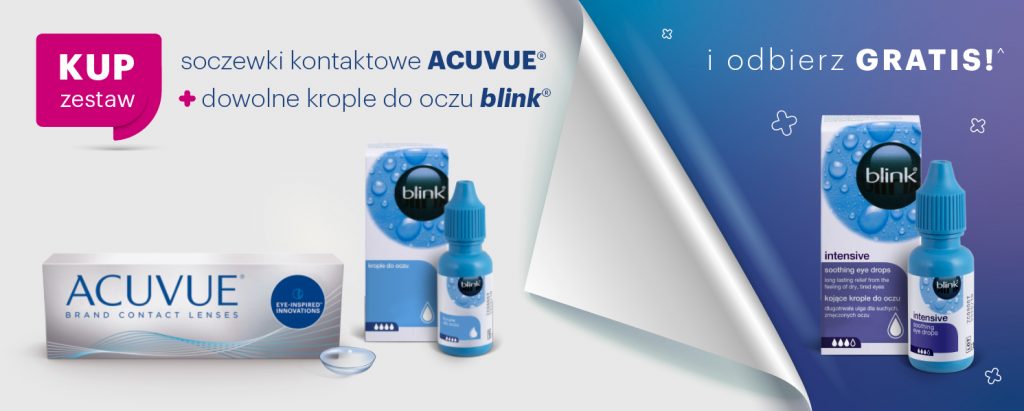 Promocja trwa od 01.05.2020 r. do 31.07.2020 r. lub do wyczerpania voucherów. Promocja polega na uprawnieniu konsumenta do otrzymania jednego opakowania kropli blink® intensive gratis przy zakupie jednego opakowania soczewek kontaktowych ACUVUE® OASYS, ACUVUE® OASYS for ASTIGMATISM, ACUVUE® OASYS 1-Day, ACUVUE® OASYS with Transitions™, 1-DAY ACUVUE® MOIST, 1 -DAY ACUVUE® MOIST for ASTIGMATISM lub 1-DAY ACUVUE® MOIST MULTIFOCAL i jednego opakowania kropli blink® intensive, blink® intensive plus, blink contacts® lub blink® intensive unidose. Z Promocji można skorzystać wyłącznie w salonie optycznym biorącym udział w Promocji, w którym Uczestnik dokonał zakupu soczewek kontaktowych ACUVUE® oraz kropli marki blink® objętych Promocj. Organizatorem Promocji jest Johnson & Johnson Poland Sp. z o.o. ul. Iłżecka 24, 02-135 Warszawa. Regulamin dostępny jest w siedzibie Organizatora oraz na stronie internetowej Partnera.