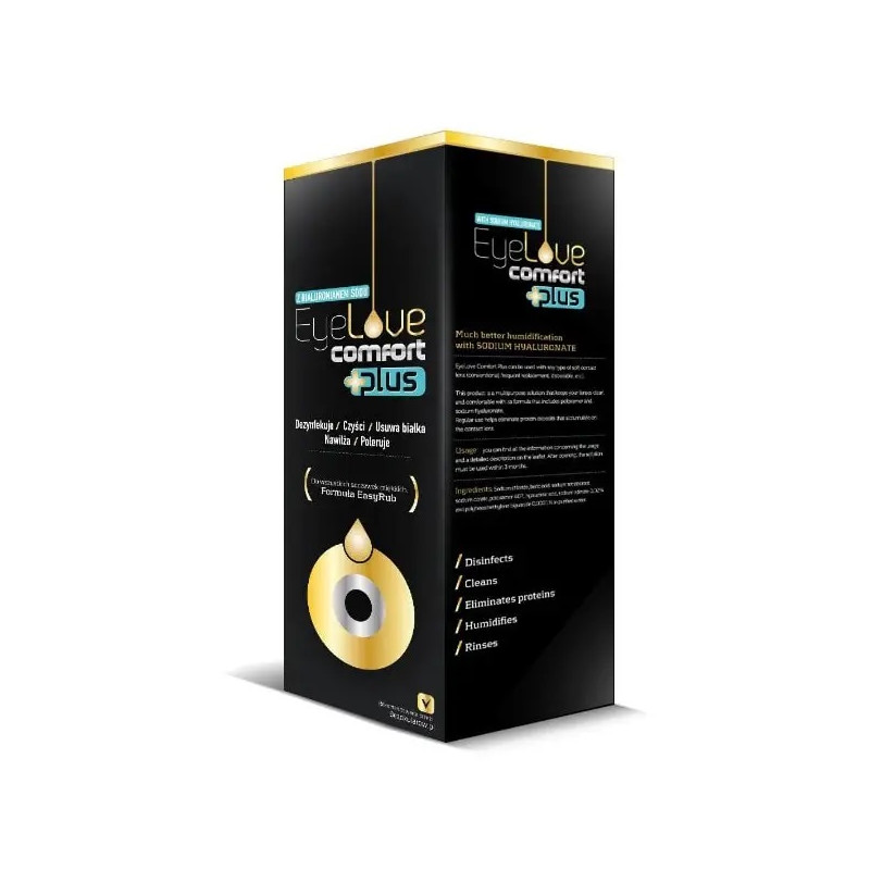 EyeLove Comfort PLUS to wielofunkcyjny płyn przeznaczony do codziennego czyszczenia wszystkich miękkich soczewek kontaktowych.