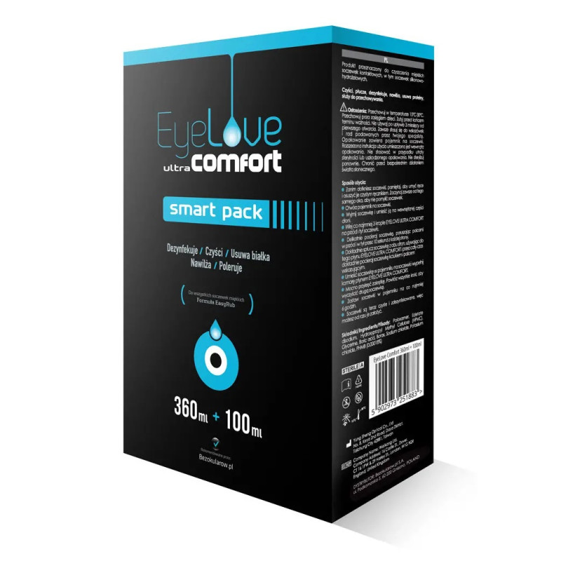 EyeLove ultraComfort SmartPack to nowoczesny, wielofunkcyjny płyn do pielęgnacji soczewek kontaktowych, w tym również wykonanych z materiałów hydrożelowych i silikonowo-hydrożelowych. Pakiet płynów został zaprojektowany z myślą o osobach, które cenią wygodę, praktyczność i higienę w codziennym użytkowaniu soczewek.