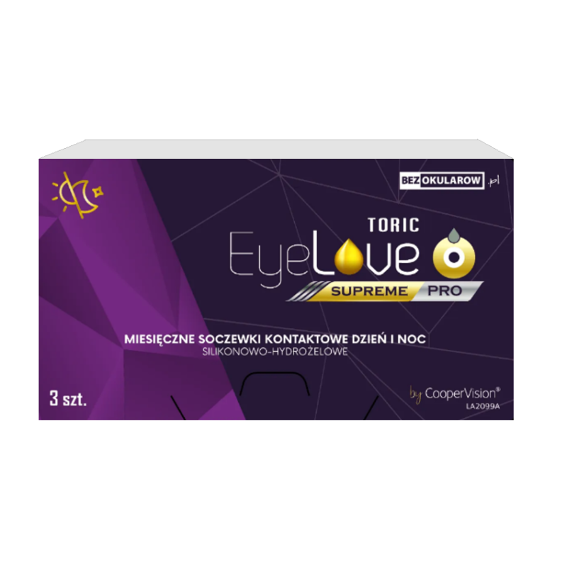 Miesięczne soczewki toryczne EyeLove Supreme PRO Toric zostały stworzone z myślą o osobach z astygmatyzmem, które oczekują stabilnego widzenia i wysokiego komfortu noszenia. Do ich produkcji wykorzystano nowoczesny materiał silikonowo-hydrożelowy nowej generacji, zapewniający oczom bardzo wysoki dostęp tlenu do rogówki.